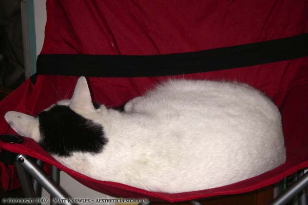 Paula came to visit last weekend and left a couple of her folding camp chairs. Artie immediately realized how well the black and red of the chair looks so well with the black and white of his fur, and so it has become his favorite place to snooze lately. He looks pretty comfy, so I can’t say I blame him.