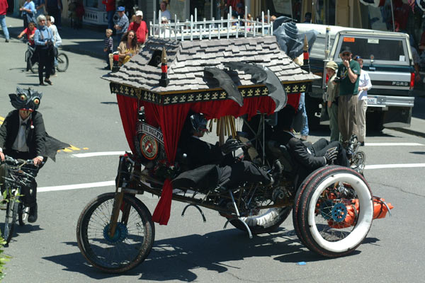 As usual, my favorite entry comes from the Duane Flatmo crew. (You might remember Mega-sore-ass, and Surf and Turf from previous years) This year’s entry was modeled to resemble a Victorian hearse, staffed with a bunch of bats. The details of machine, crew and their band of bats that circled them was fun to watch. Once again I was wishing I had a video camera handy.