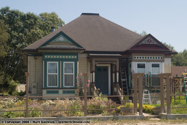 As I’m making my way down the bay window, one more element of the new color scheme became evident. Another touch of blue showed up on the squares above the windows. In designing the color scheme, I have reversed the traditional way of applying colors. Normally the darker colors are used for the parts that recede, such as the window sashes. But since the windows in our house had been replaced with white vinyl sashes that wasn’t going to be possible. And since we wanted the house to be dark brown, it made sense to just reverse everything so the body is dark brown, the trim is tan, the window surrounds and panels are cream. That left the placement of the two accent colors and I finally decided on this theme; if it was a horizontal line it gets the read treatment, and if it is a repeating element like the squares or the balls on the gables, it gets the blue treatment.
