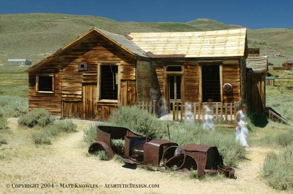Starting with the same Galen Rowell seminar mentioned earlier, I had made three previous trips to Bodie, all unsuccessful due to the weather. You can’t be a photographer and not see pictures of Bodie. And once you’ve seen pictures of Bodie you have to go there. So it was with great anticipation that we made our drive to Bodie after visiting Mono Lake for the sunrise. (I guess I should mention a bit about Mono Lake here. While the bumper sticker campaign worked, and the “Save Mono Lake” is now in progress, what is good for seagulls isn’t so good for photographers. The famous tufa towers are now disappearing back under water, where they’re supposed to be.) Bodie exceeded my expectations and I’m already thinking about when I can go back. What a great time capsule! While a ranger was giving us an overview presentation in the morning, I noticed his intern Julia. I persuaded her to pose for the ghost pictures that I wanted to create. We had some of our Victorian clothes with us so during her lunch break we got here dressed up and then took several series of pictures. I then combined the photos with her in them with one without her in Photoshop, to make this ghostly creation.