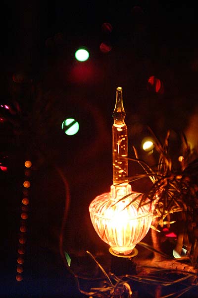 After a two day project, Lori finished decorating the Christmas tree. 10 foot ceilings allow you to get a pretty big tree, the limiting factor appears to be the width of the front door. Our tree fits in the bay window very nicely, like it was made for it. We cut our tree at a lot in Loleta, for only $19, what a deal for a 9 foot tree. I can’t give the whole tree away just yet since it would spoil it for those family members who are coming to see us for Christmas. But I decided to show you my favorite part, bubble lights! These were always my favorite memory of Christmas at Grandma Knowles’ house. It was always a lot of work to get them started, but once they were bubbling, they were fascinating to a little kid. They seemed to disappear from the market for a long time but last year we saw them again so we bought a couple sets. Reading the warning labels I’m surprised they can still sell them. What makes them work is methylene chloride, which I am really familiar with because I used gallons of it stripping paint in our old house. Aside from stripping paint, it will burn your skin nicely and disolve most plastics. It’s also a carcinogenic. So make sure you don’t break those bubble lights folks.