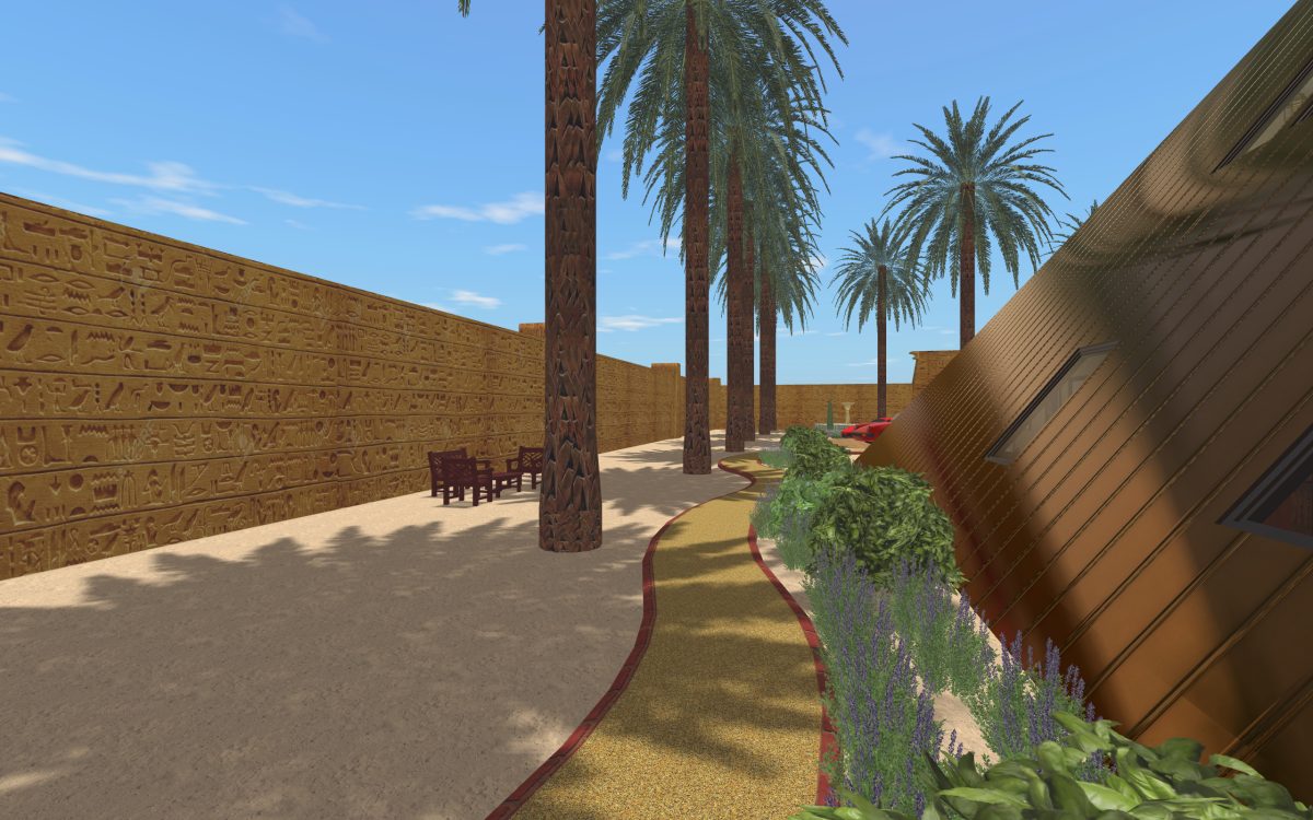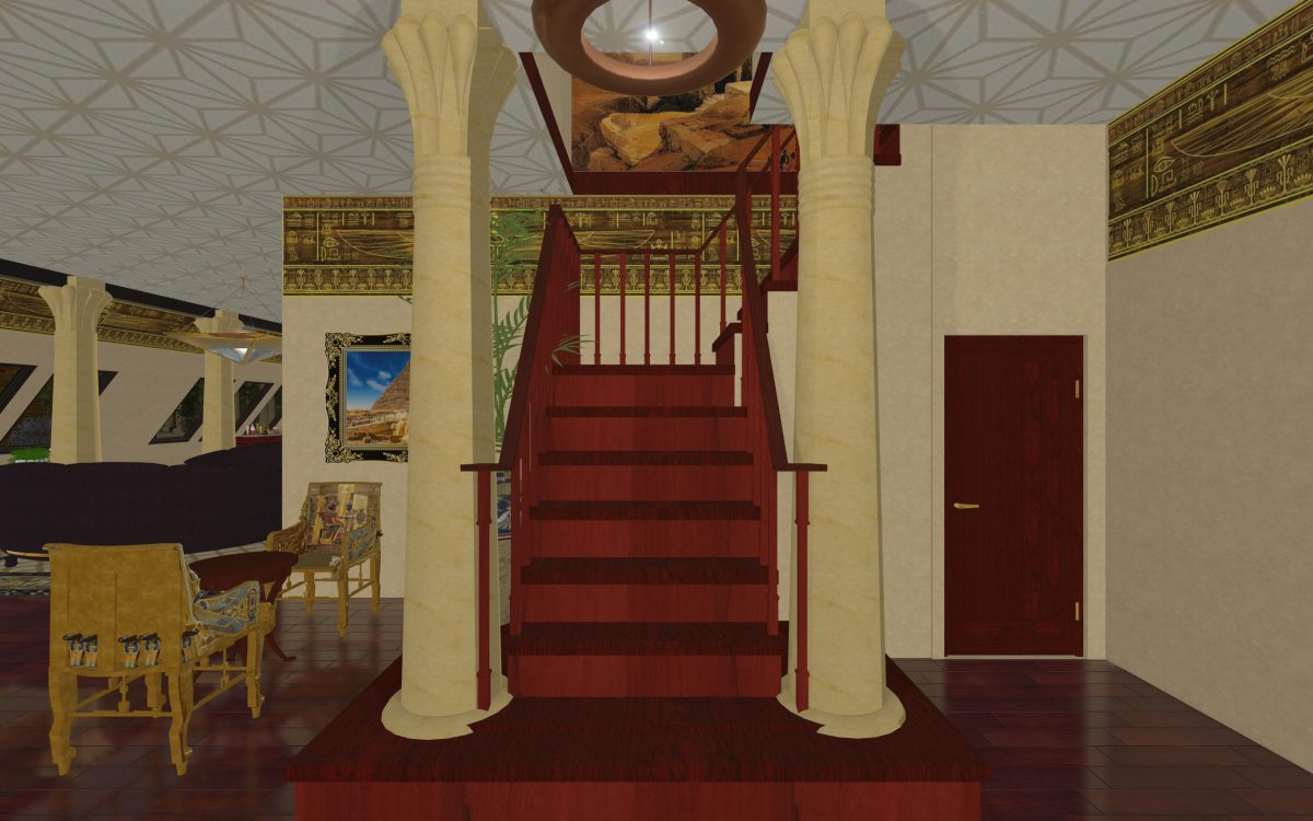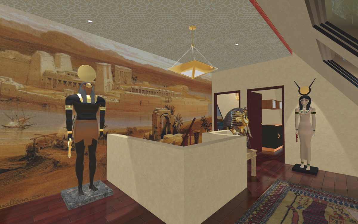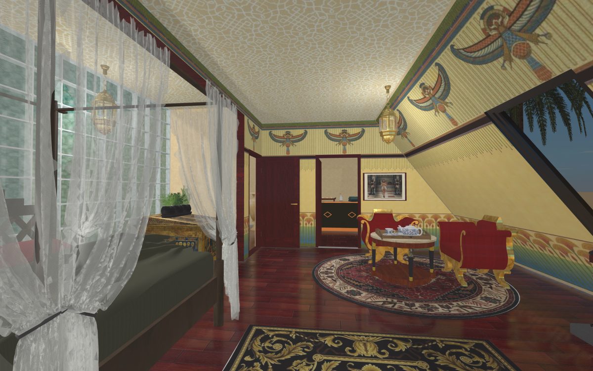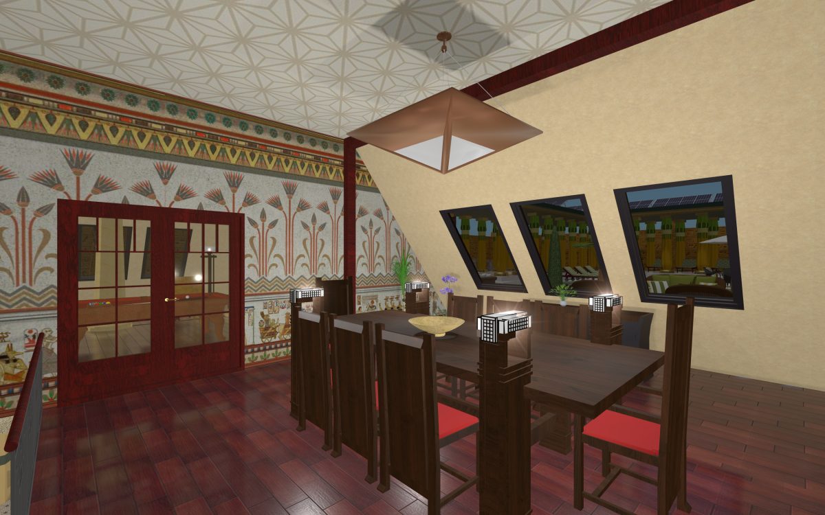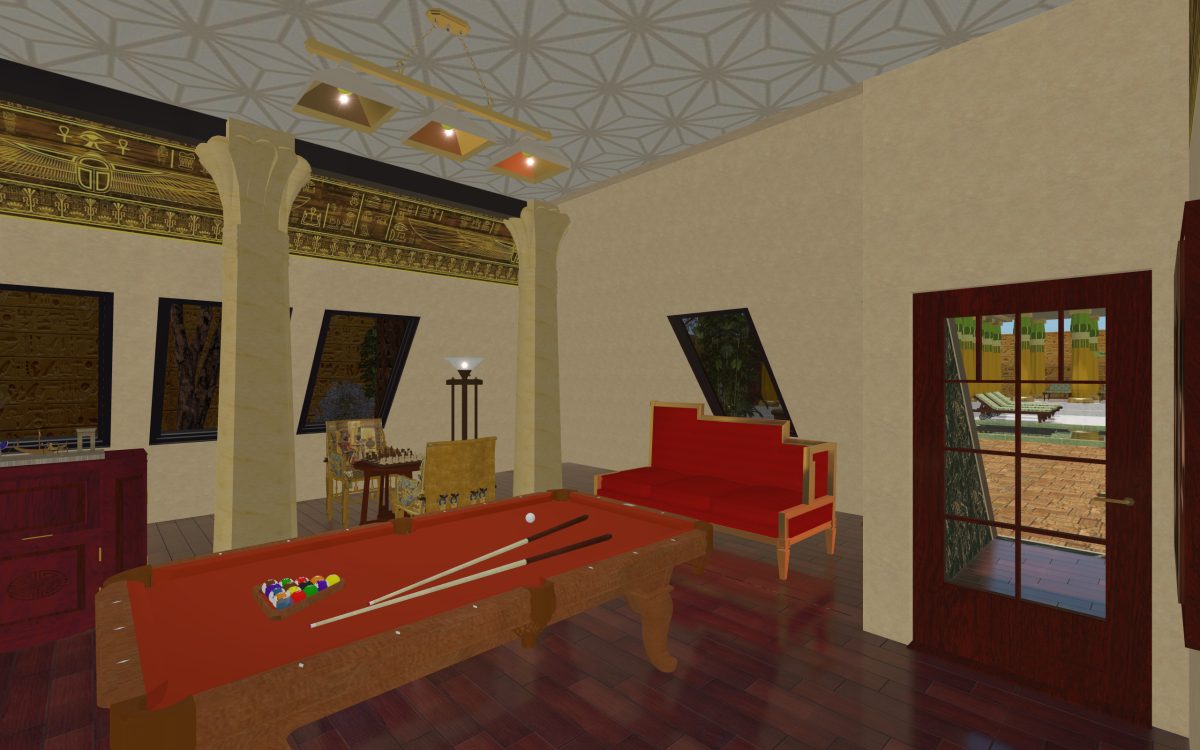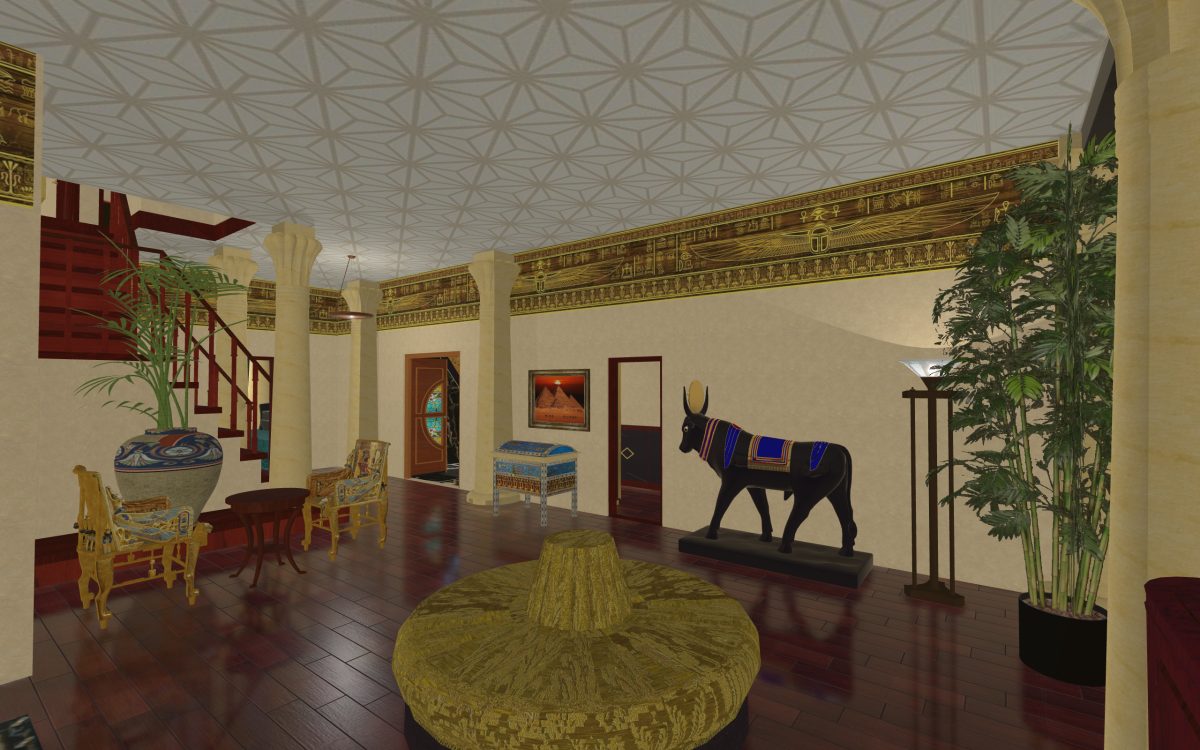 In many of our previous houses, there has been one room done in an Egyptian style. One of my first projects had an Egyptian parlor, the next project had an Egyptian bedroom, and another had an Egyptian styled home theater. Since we’re going around the world designing homes, we thought it was time we design a whole house for Egypt.