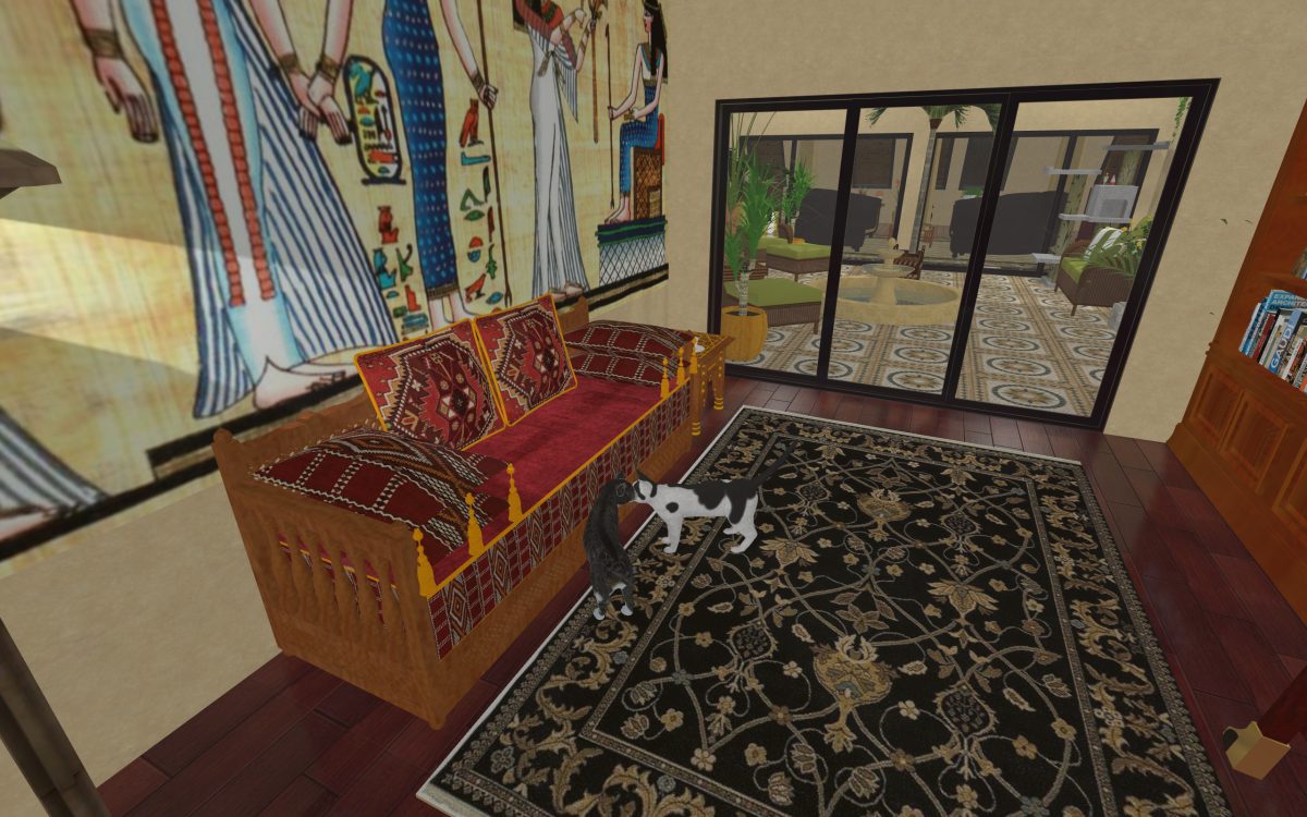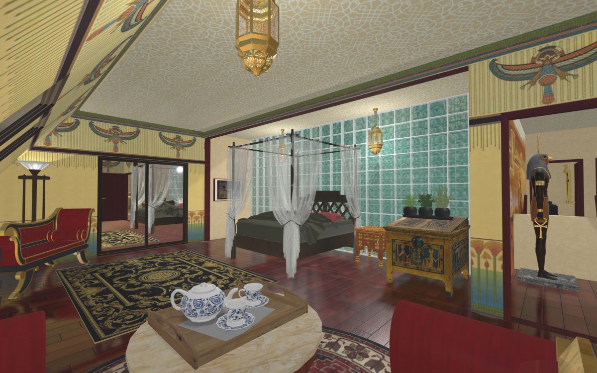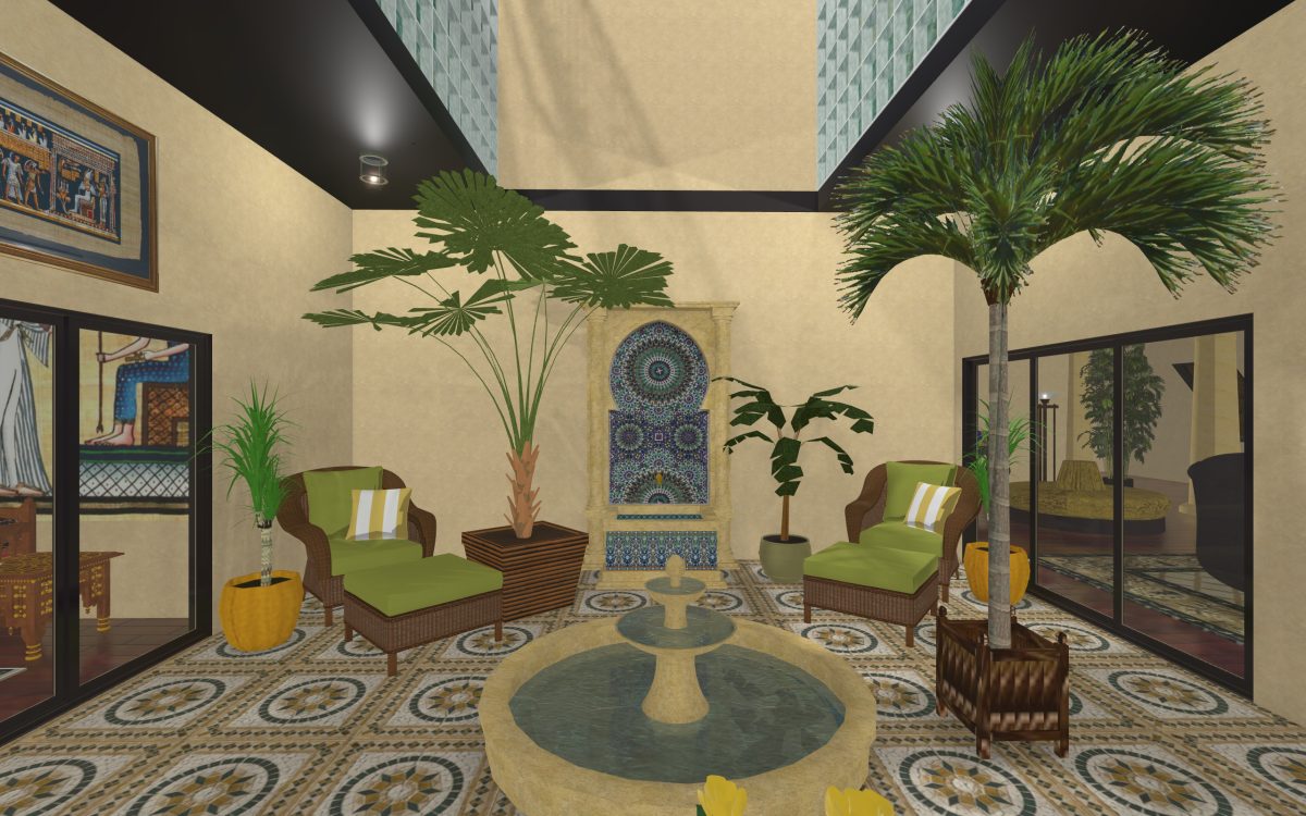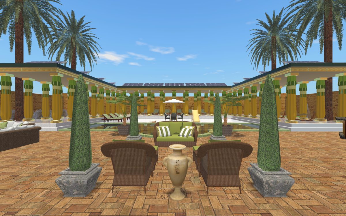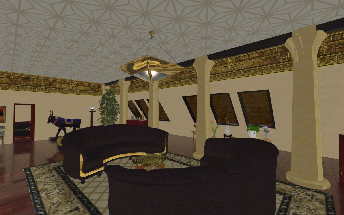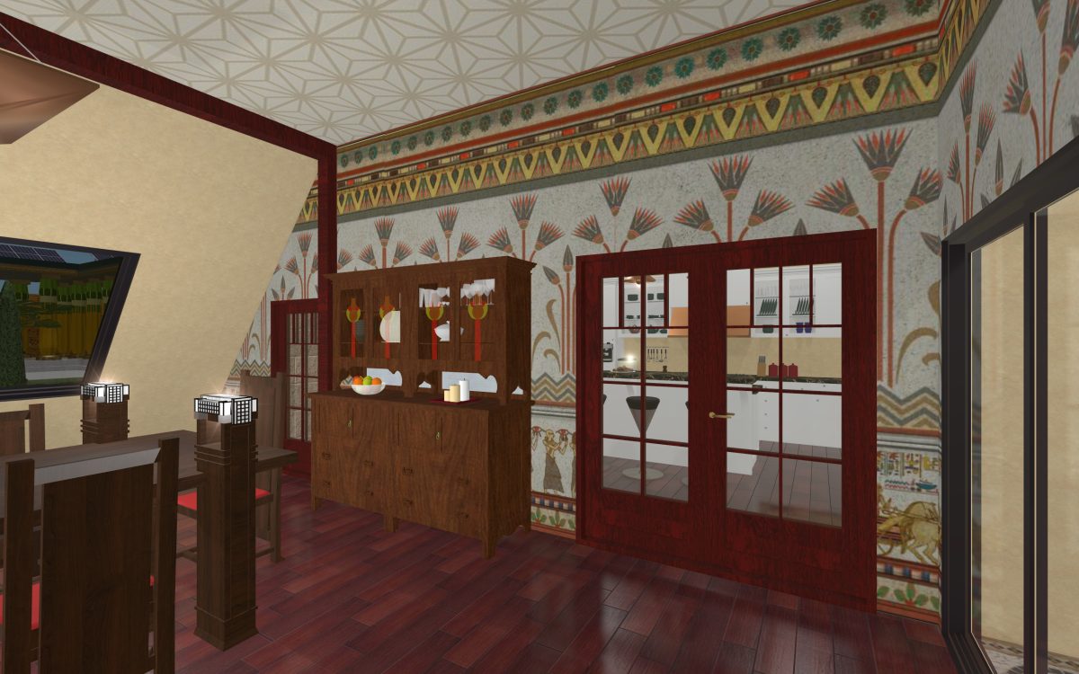 In many of our previous houses, there has been one room done in an Egyptian style. One of my first projects had an Egyptian parlor, the next project had an Egyptian bedroom, and another had an Egyptian styled home theater. Since we’re going around the world designing homes, we thought it was time we design a whole house for Egypt.