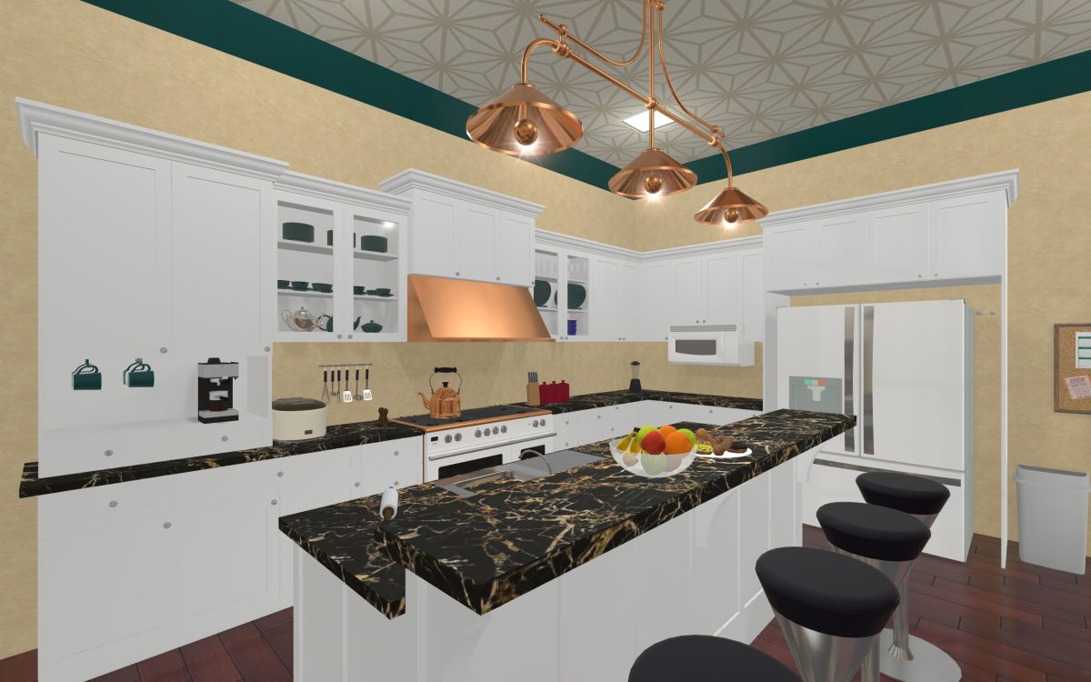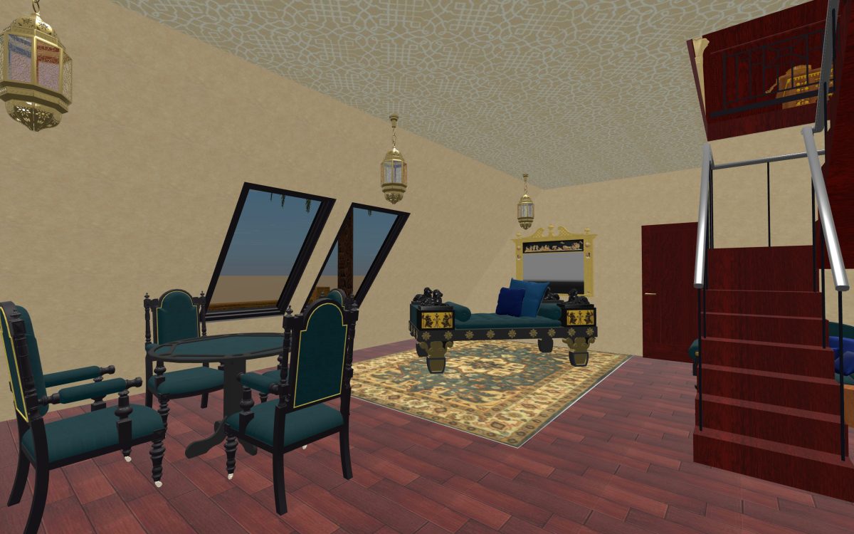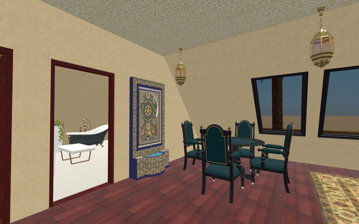 This is the ballroom, and it was modeled after the previously mentioned 3D temple model I used. Some of the decoration comes from that model, and some comes from a wallpaper we hope to someday use in our real house, and then other elements came from the SketchUp 3D library we use so often.