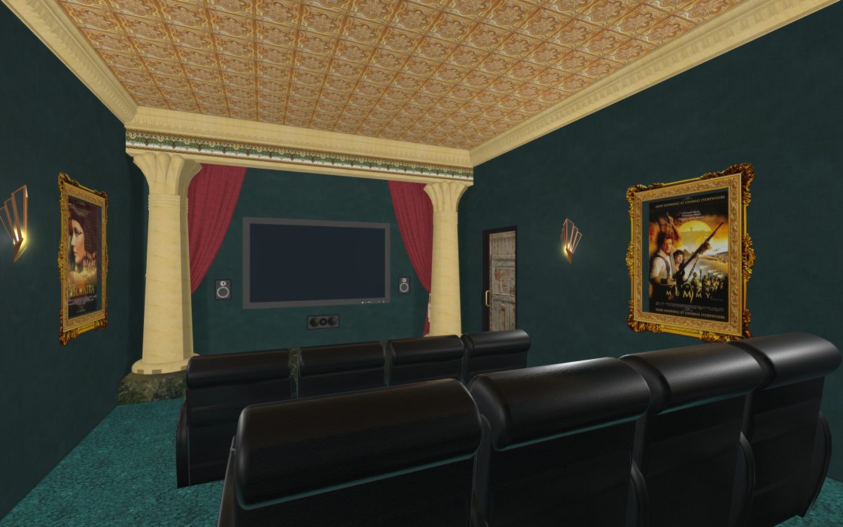 In most of the home theaters I’ve designed I’ve decorated the walls with coming attractions posters. The two in this room are Cleopatra and The Mummy. Passing through the theater we pass the popcorn machine and out of view are two vending machines, one for soda and one for snacks.