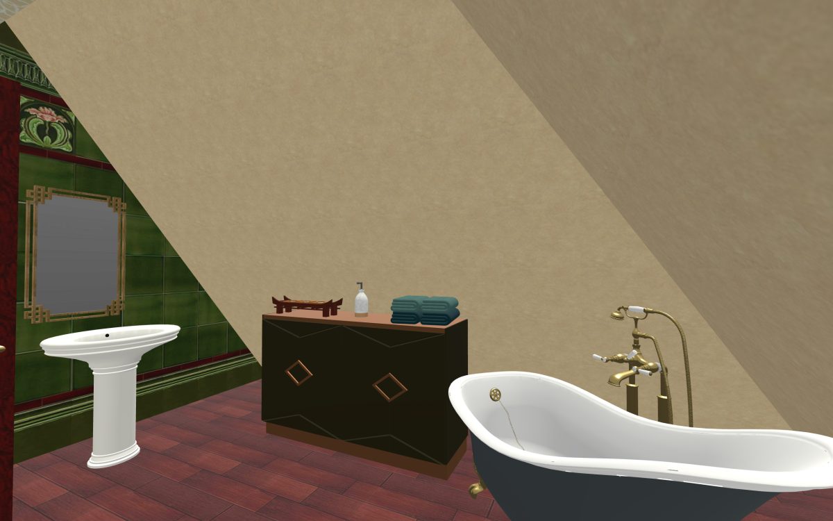 We’ll take a look at the master bedroom first. If you’ve viewed some of the models we’ve done, you’ll recognize this wallpaper. This again is part of the set we hope to use in our house if we ever get to that room. Being a digitally printed wallpaper it made it easy to match the pattern when it goes from a straight interior wall to the sloped exterior wall. Easy to do on the computer, tough to do in real life.