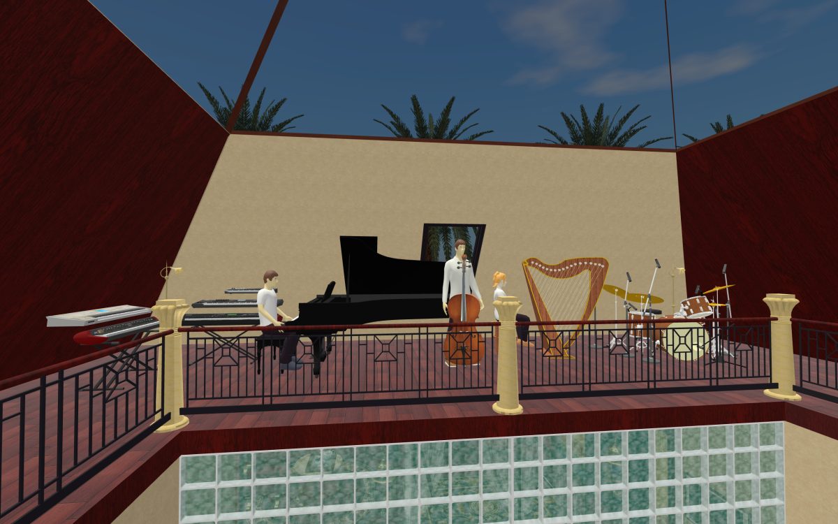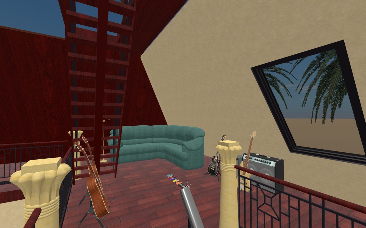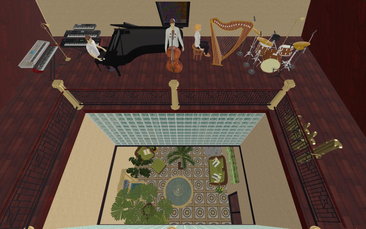 We head up another flight of stairs to the third floor. Due to the pyramid shape of the building and the courtyard in the middle the third floor isn’t much more than a wide walkway. But we’ve made this floor our music room with a wide range of instruments to practice on. Due to the courtyard, musicians can play here and entertain guests two floors down in the living room.
