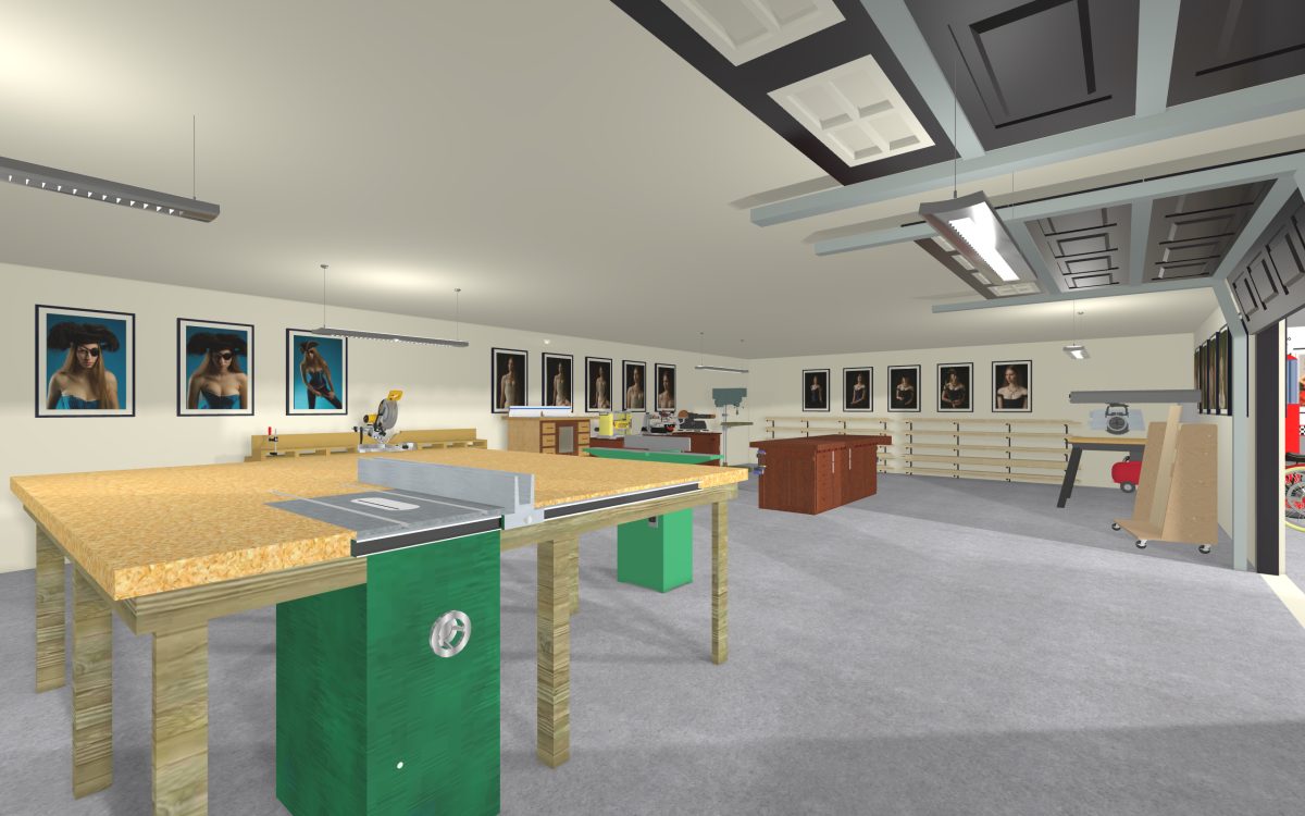 As we make our way down the garage ramp you’ll see the black and gold marble that is used throughout the house. After parking our car, we’ll visit the woodshop. It has it’s own set of garage doors so that in the up position they provide a bit more room to park the cars or turn around, and when doing woodworking they can be lowered to better contain the noise and dust.