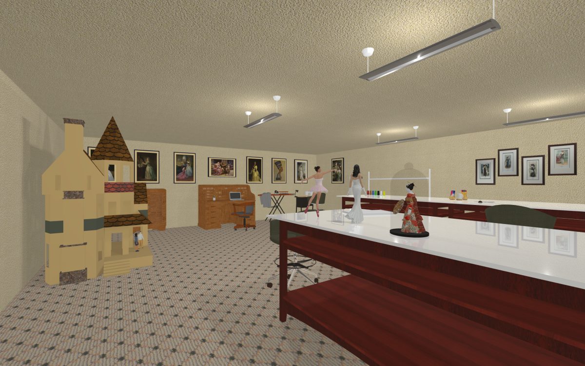 After visiting my wood shop, we next visit Lori’s creative room. Here she has large tables to work on her patterns and sewing, with lots of storage space for her vintage clothes and fabric scraps she tends to collect. There’s a huge dollhouse since the dolls she collects are 1/4 scale, not the more common 1/12 scale.