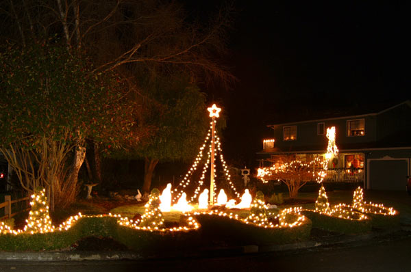 After the second call I mentioned to Jay our dispatcher that if we were going to have another call today, 4:00 would best fit my schedule. We did the shoot with Jay’s family at their home, and then I scarfed a quick but delicious meal down the street from our studio. That left a few minutes before our next shoot at the studio, which involved 12 people and four generations of one family, all dressed in Victorian clothes. After that was finished, Lori and I closed the studio. I took the Sprint out since it was clean from the earlier photoshoot, and enjoyed a short but refreshing ride. I got back home a little after 4 and driving down Rose I noticed some funky smoke coming from Glen Martella’s home. It didn’t look normal, but at the time it also didn’t seem serious enough to warrant stopping. Five minutes later though we were paged to Glen’s home for fire number three of the day. Time of the call was 4:15, just a few minutes off schedule. Glen is a member of the FVFD, so I’m sure he’s going to be hearing a lot about this one. After that fire, we had just enough time to watch Home Alone before heading over to Mary and Glen’s for Christmas Eve. The photo is of Mary’s garden, and Glen’s lighting handiwork.
