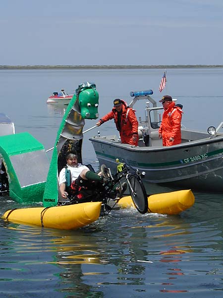 Day two of the Great Arcata to Ferndale Kinetic Sculpture Race took the contestants from Eureka, to Fields Landing and then to a campsite in Loleta where they rested up for the biggest challenge, Monday’s navigation of the Slippery, Slimey Slope. The biggest challenge in today’s portion was in Fields Landing where they had to go down the boat ramp into the bay, paddle around a bouy, and then for full credit, make your way back up the muddy beach. Some teams took a short cut and came back up the boat ramp. Others skipped the whole thing. The Yellow Submarine Team (actually a fiberglass septic tank on wheels) trailered their vehicle to the landing and after launching it they drifted towards Ferndale, fruitlessly pedaling their craft. Finally the Coast Guard had to come to their rescue. Loch Nut Monster, (pictured), had a mechanical failure of one of its pontoon supports and also had to be towed back in.