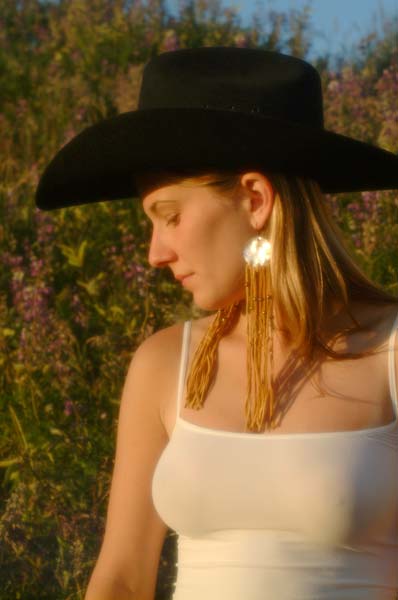 I don’t know if Chelsea knows how to ride a horse, but she wanted some pictures with her cowboy hat. Good excuse to try out the leather earrings I saw in a store a while back. I love dangly earrings, and these are just about the longest I’ve ever seen so I had to buy them.