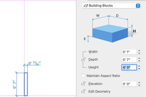 I started building it just as if it were being constructed out of wood. The first step was to build a riser using a building block rectangle. The standard stairway has a rise of 8″ and a tread of 10″, so my first block for the riser was 1″ x 7″ x 4′ since I wanted the stairway to be 4′ wide.