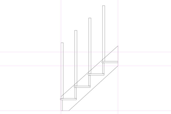 Then draw the stringer using a building block polygon. I found it helps to layout some guides, and then just eyeball the diagonal lines. You could also build a rectangle, rotate it, and then edit the contour to cut off the parts a carpenter would. That’s one thing that’s always helpful to keep in mind, that the building blocks are like raw lumber that can be manipulated into the shapes you need.
