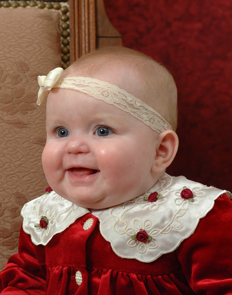 This is 7 month old Darrian, who came in recently with her family for a portrait. After we finished the group shots I started taking individual shots of the kids. I started with Darrian’s 4 year old brother, then Darrian. Unfortunately, Darrian’s twin sister fell asleep before it was her turn. But this photo of Darrian was a favorite from the session. All dressed up in her Christmas clothes, she looked like a little porcelain doll.