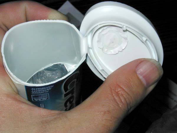A few weeks ago when we had guests staying at our house, someone (I’m guessing Derek from past experiences) left their toothpaste behind. Maybe we’re behind the times, but I had never seen one of these toothpaste in a pump thingies. So after we finished using it, I had to cut it open to see if my theory on how it worked was correct. Which it was. There is a foil bladder inside that contains the toothpaste. There is also a one way valve on the bottom of the container. Squeezing the container puts pressure on the bladder since the air valve is closed. Then releasing the pressure sucks in more air so it is ready for the next use. Very simple and efficient design. I’m not sure how much more expensive it is to buy toothpaste this way, but it’s a design I like. Sure beats all of the stupid inventions I’ve seen that supposedly help you squeeze a normal tube of toothpaste.