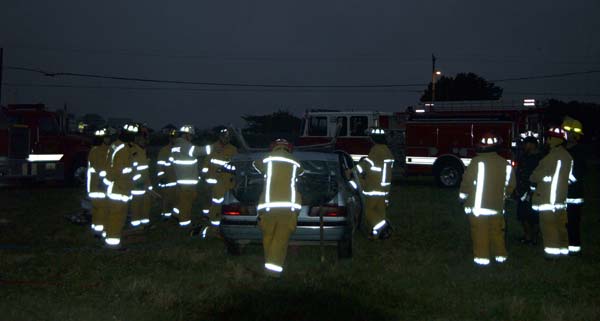 Drill Night Knowlesville Posted on August 19, 2005 by MattMay 20, 2019 Third Thursday of the month means it’s fire department drill night, and tonight’s drill was on auto extrication. That meant the jaws were out and two cars fell victim to it. As you can see, firemen and firetrucks are quite visible at night.