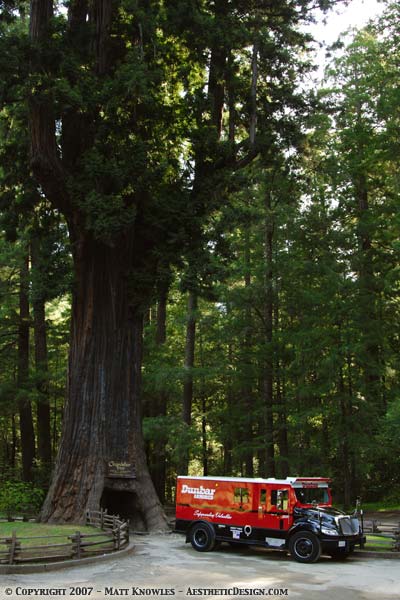 I went down to Legget to the “World Famous Chandelier Drive-Thru Tree” to take a photo of this armored truck for Dunbar’s 2008 calendar. Obviously, this truck didn’t actually drive throught the tree. In fact after I got there I saw what the biggest vehicle you could drive through it was. A full size pickup truck was trying to make its way through and had to fold the mirrors, and then it just rubbed the top of its camper shell on the roof of the tree. Any bigger and they would have had to let the air out of their tires to make it. The driver was only slightly disappointed that this required stop for tourists left his truck with scratches. He still thought it was worth the $5.