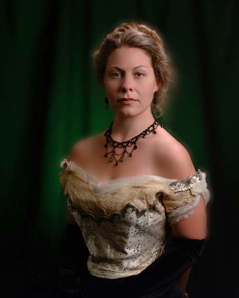 I recently placed some fliers at College of the Redwoods regarding modeling, so hopefully in the next few weeks I’ll be introducing some new faces here. This is Erin, and she’s modeling an evening bodice from the early 1900s. The lady who wore this bodice originally must have had quite a bossom. I think we’d need a model with a pair of those really huge implants to do this bodice justice.