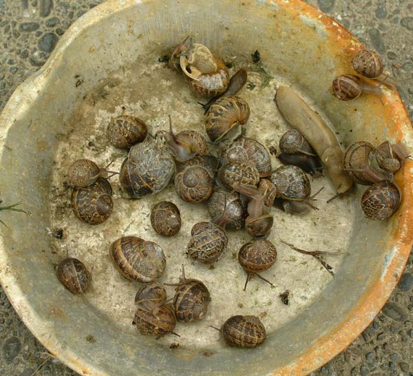 This morning while on my way out to the mailbox, I noticed that the rosebed in front needed some weeding again. While doing that I noticed a number of snails and slugs hiding in the iris that are planted in between the roses. Those snails and slugs were thrown out in the street to meet their death under the passing trucks. But then I noticed a number of snails also attached to the house so I went around it a pulled off the ones I could reach. Halfway around the house I came across an aluminum pan which I used to squash one partilcularly large slug specimen. After that, I collected everything else I found on the other half of the house, and this panfull is what I ended up with. Yech! No wonder our house looks like it needs a date with a powerwasher!