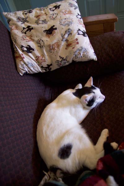 When Artie first came to visit our house, he had a wound on his tail, and it never really healed. Last week it seemed like it was getting infected, so we took him to the vet, and while he was getting his tail fixed, he got something else fixed. Well, that’s what they call it. I don’t see how that really fixes anything, just the opposite really. So since he was on antibiotics we kept him inside for the last week. Fortunately we found out he’s familiar with using a litter box, although he’s not aware that polite cats cover up their deposits. We also found out that the speed of smell in a room with no breeze is approximately 6 inches per second, calculated by the amount of time difference between when the person sitting closest to his box goes “ewwwww” and the person sitting farther away gets a clue about what the “ewwww” was about. Artie’s odors weren’t just from the liter box, he seemed to be having an excess gas problem that was venting at inopportune times. Hopefully this is just related to the antibiotics he’s on.