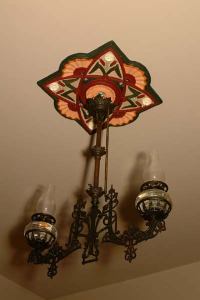 Today I finished painting the ceiling medallion and got it mounted in the parlor. So all of you who were polled earlier can check out the results. I think the colors will make a lot more sense when the rest of the room is decorated, but for now it’s a great feeling to have made some progress in the restoration.