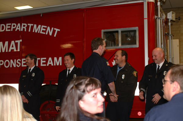 Tonight we had our graduation for the Firefighters Academy. Once again Lori proved that she’s not the photographer in the family. The truck in the background is Eureka’s HazMat truck, which is a converted beer delivery van. The fireman on the left was our teacher for the HazMat class I also took recently. If you pay attention you can see him hassling Dustin Hoffman in the movie Outbreak, just as Dustin arrives in Ferndale in his Humvee.