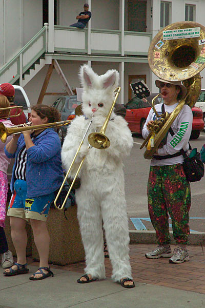 The Humboldt Lumberjack band came into Ferndale (minus Lori Ann Crist, who was attending Arthur’s graduation at home) for the finish of the Kinetic Sculpture race. It was a typical overcast Ferndale morning, for which I’m sure this guy was grateful. Even so I saw him pull the head of the costume off after a couple of songs, and he appeared to be trying to get sweat soaked fur off of his face. Didn’t look too comfortable.