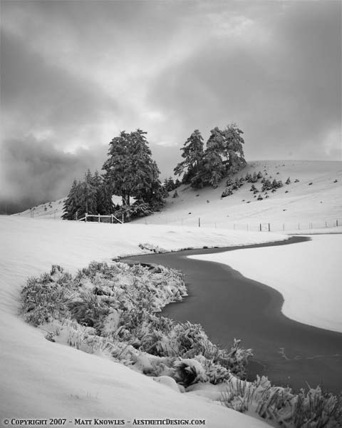 When it snows in the local hills, this is one of my favorite places to go take pictures, Kinman Pond. Named for Seth Kinman, who was famous for making chairs out of antlers, the pond is located up in the hills above Ferndale. Lori and I got up early and drove up there Wednesday morning and were rewarded with a fresh new layer of undisturbed snow. The sun managed to sneak out between the fog and clouds for a few minutes at a time and when it did I worked furiously to get some good images. This was one of my favorites, and I’ll be featuring a few more the rest of the week.