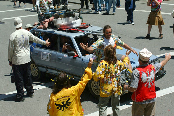 Finishing the race where everybody expected them to, this Subaru came in last. Actually the good bet was that they would be towed out of the bay by the Coast Guard. I was surprised to see that they made it. Pedaled by four guys, the vehicle’s power actually ran through the stock transmission, drive shaft, and differential. Apparently when they ran the one section along 101, many drivers failed to realize that this Subaru was people powered. So that’s it for this year’s Kinetic Sculpture Race. Hopefully next year you’ll be with us to watch it live.