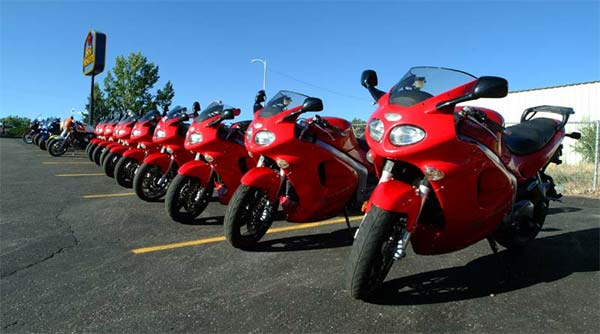 This is a group shot of most of the bikes that attended the rally. Mine just happens to be in the foreground, which means it was the most vunerable if anybody tipped one over. The line up was done in the motel parking lot which was sloped downhill, so everyone was hoping there wasn’t a sudden gravity storm. As you can see, the red Sprint ST was the most popular.