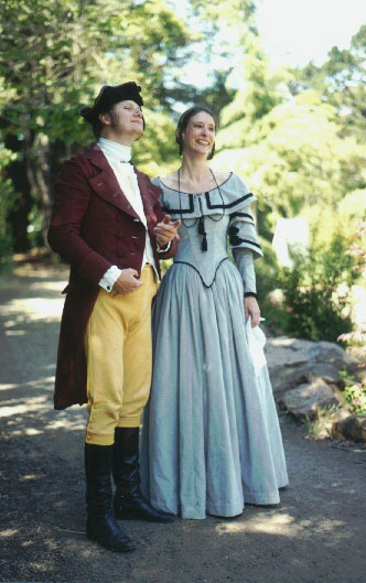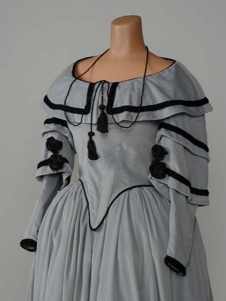 Grey velveteen with black braid, worn over reproduction ruffled petticoat. Design based on an original garment in the Victoria and Albert Museum.