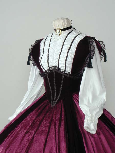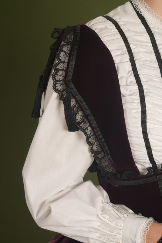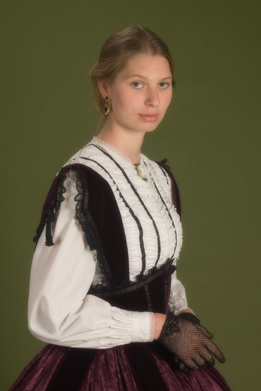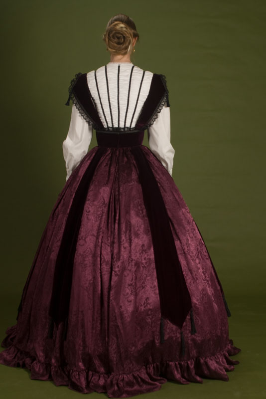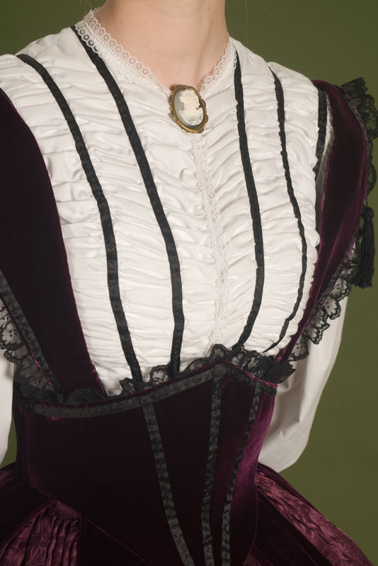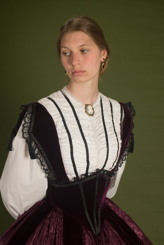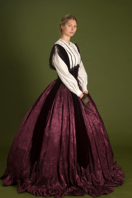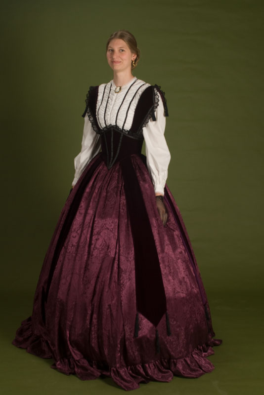 White cotton bodice with wine velvet bretelle corselet over a jacquard skirt, with crinoline underneath. Design from Godey’s Lady’s Book.
