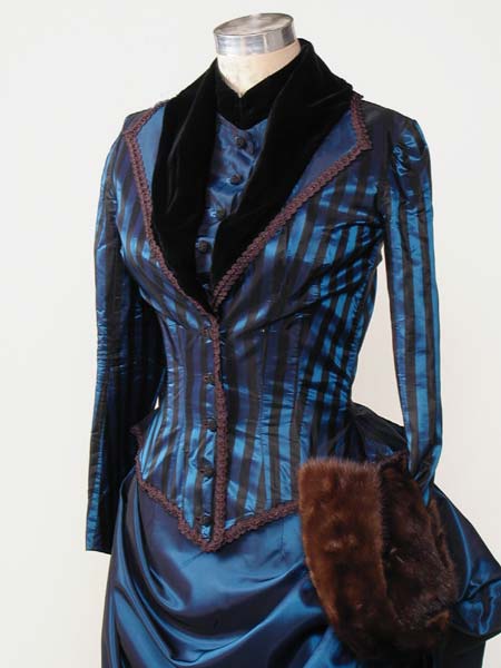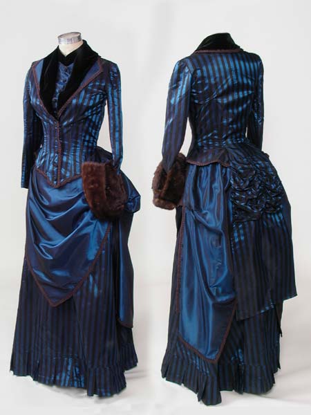Blue/Black striped bodice with velvet trim and tails, worn over a draped bustle skirt. Underneath is a bustle pad and petticoat with ruffles down the back. Design from Butterick catalog.