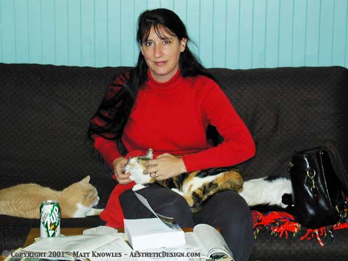Lori’s adjusted to being out of work Knowlesville Posted on January 11, 2001 by MattFebruary 25, 2019 So here’s the historic first photo on Knowlesville. Lori and I recently moved from San Jose to Ferndale. Lori’s taking time off from working to write her patternmaking books. And apparently, petting the cats.