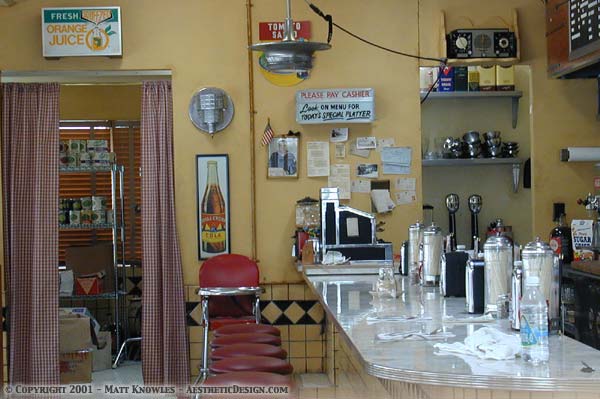 Today’s picture shows the interior of Mabel’s Diner. Not only is it an exterior set, but they also use it to shoot scenes in, although it’s hard to picture how they get all the crew and equipment in there and still have room for the actors. The set is so realistic that when tourists come in on the weekends, they have been known to walk up to it and comment that it looks like they can’t eat there because the diner is closed.