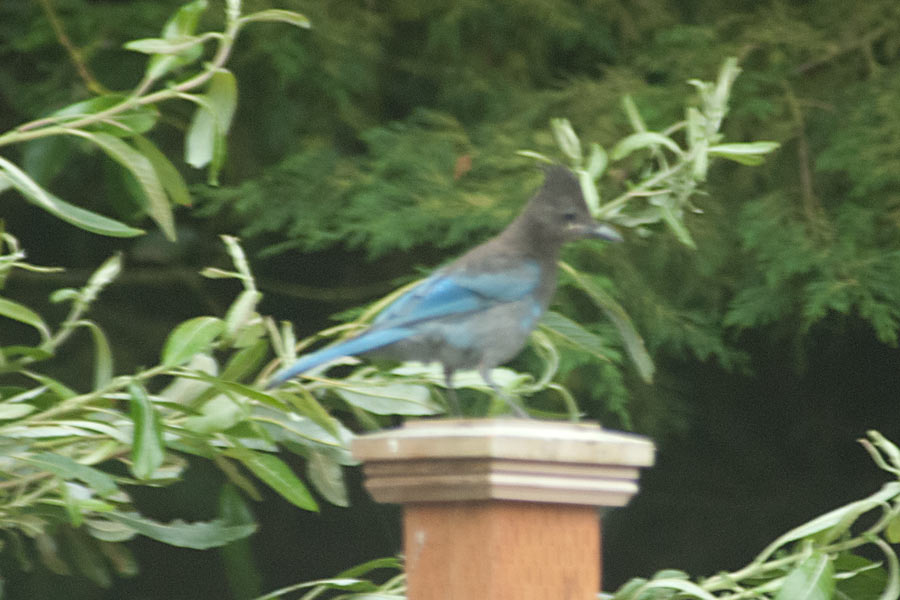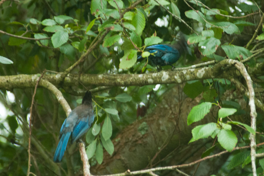 (Cyanocitta stelleri) – Lori and I heard a racket out in the backyard and since it wasn’t a bird noise I’d heard here before I was worried that one of the cats had gotten ahold of a bird and I was hearing a plea for help. Going out to investigate, I found a group of Steller Jays up in the trees, a very safe distance from our cats. This was the first time we spotted jays in our yard, and within a few minutes they had taken their noisy conversation elsewhere. I grabbed the camera and lens that was handy and it wouldn’t have been my first choice. Hopefully they’ll return so I can get better pictures. (spotted 7/26/2019)