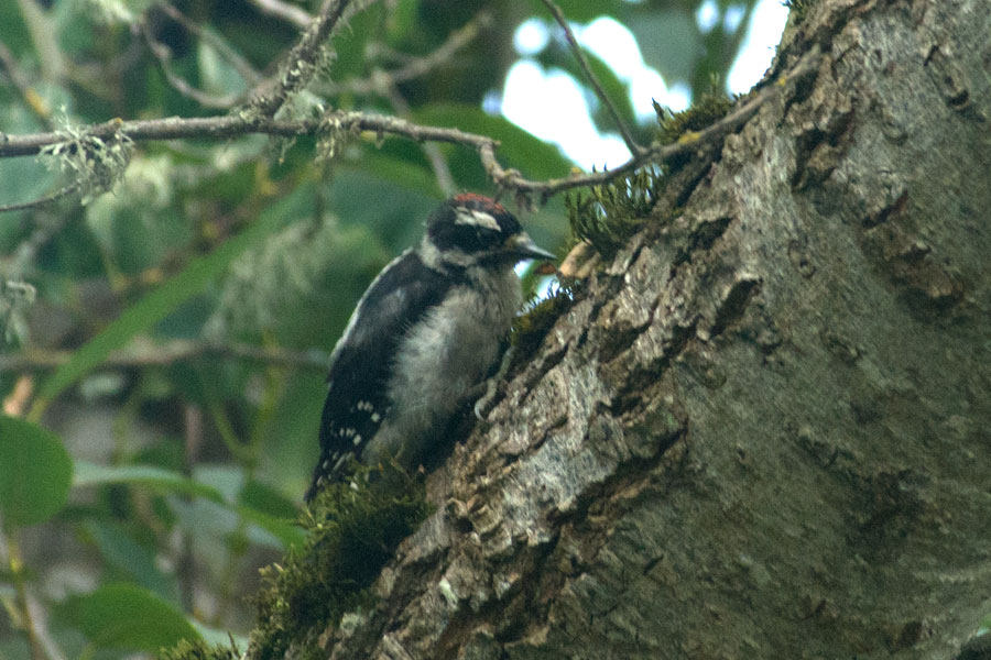 (Dryobates pubescens) – Lori first saw a male on one of our fence posts but it flew away before we got a good look at it. She noticed the red on the back of the head, which sounded like a woodpecker to me. But was it a Downy or Hairy? A couple of days later I spotted a female in the willows, and using binoculars I was able to identify it as a Downy. It’s going to be hard to get pictures of these birds. I most often hear them lately, but they’re way up in the trees hidden from view. (spotted 8/12/2019)A week later I was in the backyard and heard the familiar knock of the woodpecker in a willow close to the house. After much searching I finally located him and was able to get a photo of one.