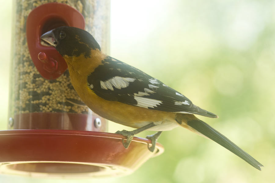 (Pheucticus ludovicianus) – This was one really lost bird. Obviously a male, he didn’t stop to ask anyone for directions, and somehow ended up on the western side of the Rockies rather than the eastern where he belongs. He showed up one day at the feeder at the same time we usually see the Black-Headed Gosbeaks. In shape and size he was just like the normal gosbeaks we see, but his coloring was completely different. At first I thought he must be some weird mutation, but after looking it up I found out it’s a related species normally seen on the other side of the country. I hope he found his way back to his southern home.