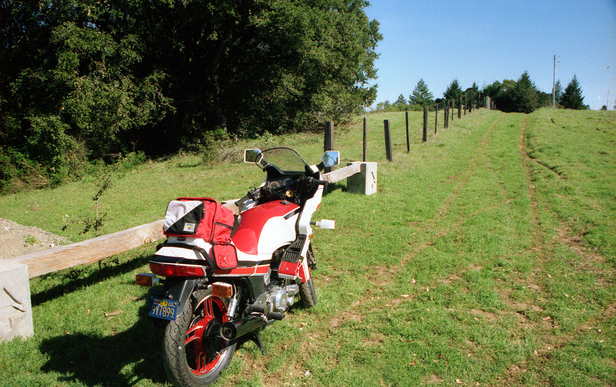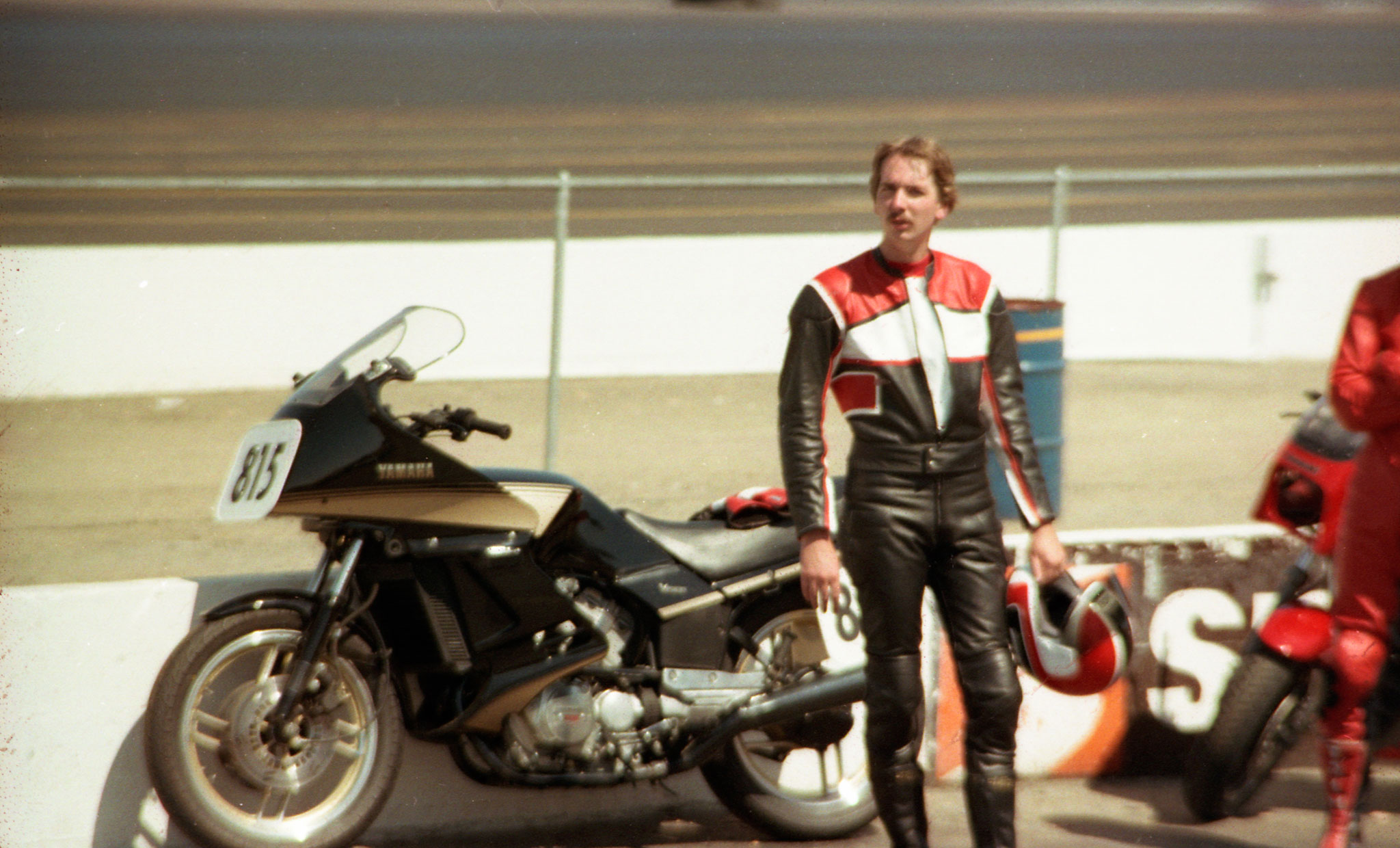 After I sold my GS550ES I took the money and fixed up the Vision. It got a new red, white and black paint job, polished and painted wheels, matching Corbin seat, custom exhaust, and a Works shock. The photo below is with my friend John on top of Mt. Hamilton, one of our favorite rides. Yes, that’s my old KZ400 that John had at that point.- Racing at Sears Point
