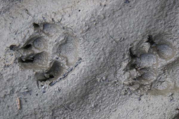 On my trip out to the mail box today I noticed a bunch of really big paw prints in the mud in our front yard. I thought this would be a good puzzle for Lauren to figure out, since I know she has a animal print guide. To help her out I’ll note that the prints were 3″ wide, and about 4″ long. I spent some time looking them up on a web site, and they weren’t what I first thought they were. For those of you who left your Field Guide to Animal Tracks at the cabin, you can research animal tracks online.