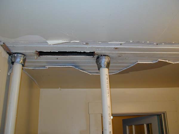 As we left for work this morning I noticed a large puddle of water on our porch floor. We had been experiencing a small intermittent leak from the exhaust pipe for the heater and I had planned to fix it if it ever stopped raining. But I noticed that the sheetrock on the ceiling and walls was starting to bubble, so I knew the problem was getting more serious. I pulled a bit of the sheetrock down just to locate where the water was actually coming from. I was surprised to find we had a beadboard ceiling underneath the sheetrock. That’s the good news. The bad news is we don’t have attic access to the porch, so I needed to cut a small hole in the beadboard to confirm where the water was coming from. Both the inlet and exhaust pipes seem to be leaking, so once again I’m waiting for it to stop raining so I can repair the seals. Then I’ll add ripping down the rest of the sheetrock to my ever growing list of house repair items.