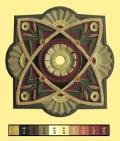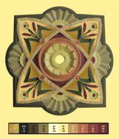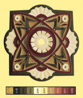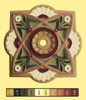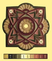 One of our stops while in the Bay Area was at Omega Salvage in Berkeley where we purchased 3 ceiling medallions. This one will go in the parlor. I took this photo so I could play with the color design in Photoshop. It’s much easier and cheaper to play with the colors in Photoshop than to experiment with real paint. I finally figured out a good way to do this in Photoshop and here are some of the “colorized” versions I came up with.