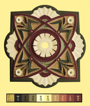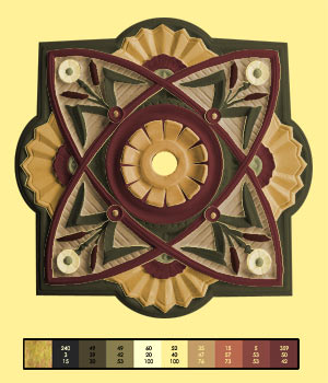 One of our stops while in the Bay Area was at Omega Salvage in Berkeley where we purchased 3 ceiling medallions. This one will go in the parlor. I took this photo so I could play with the color design in Photoshop. It’s much easier and cheaper to play with the colors in Photoshop than to experiment with real paint. I finally figured out a good way to do this in Photoshop and here are some of the “colorized” versions I came up with.