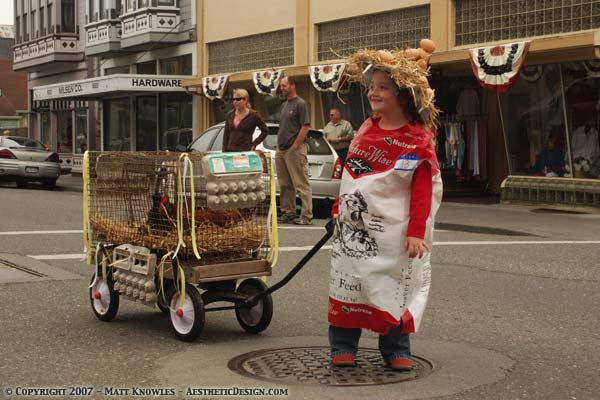 Pet Parade Knowlesville Posted on June 2, 2007 by MattJune 7, 2019 Rosemary Maede once again was the star of the pet parade. Wearing the latest in feed bag fashions, she showed off her pet chickens Ginger and Ariel.