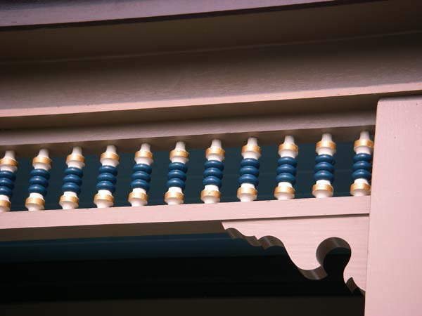 When I finished, I didn’t like the way it looked as there wasn’t enough contrast between the tan and blue and the disappeared against the shade of the porch. So I decided to paint the tan part of the spindle cream, keeping the blue portion. That meant two more coats. Then I thought I’d paint the flat part red, but after painting four of them it started looking too much like a flag store. Lori agreed, too patriotic. So then I tried brown on the next four, and while it was better than the red, it still wasn’t to my liking. Finally I tried Phil’s suggestion, gold. Since I already had gold leaf on the gable, I was hesitant to use gold paint, but it seemed to match well. Now with the blue and gold it looks kind of presidential, so maybe it’s still patriotic after all.