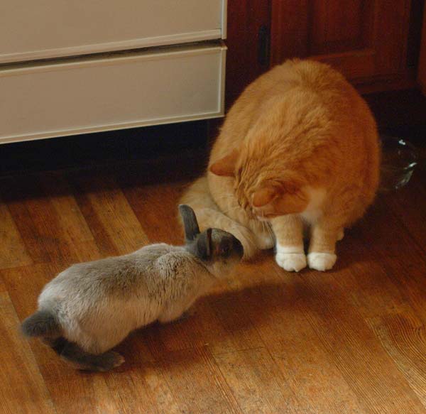 This morning we introduced our cats to the new bunny, who has been named Sophie. Fortunately they don’t view Sophie as a cat, so they didn’t feel the need to hiss at her. Also they don’t view Sophie as food, so they didn’t feel the need to kill her. They really aren’t sure what to make of her, but they seem to be more scared of her than she is of them. Kind of amazing seeing that they are about 5 times bigger than her.