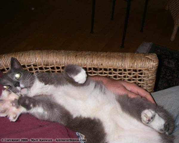 We stayed at Derek’s house while we were down there and after ignoring us the first night, Rocky finally realized that the his owners were gone and if he wanted some pets, we were it. While Lori was showering he started making a lot of noise at the front door and I let him in. He immediately came over and sat on my lap. He showed his relation to Ricky in that he couldn’t sit still, and he showed his relation to Meg in that he drooled all over me. In fact he drooled way more than I’m even used to with Meg. If you’ve seen the tiger video on YouTube, I was hoping that Rocky was having a similar flashblack to his kitty days.