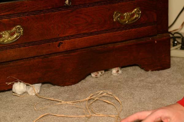 After a ham kiesh (I feel that we’re going to be having a lot of ham leftovers this week) we all gathered to celebrate the true meaning of Christmas, opening all those presents! We especially enjoyed the theme presents from the Hoopers, and only wished that they could have been here with us. The cats were pretty interested in everything going on. Meg watched from underneath the tree, and Galen found a secure spot under the TV cabinet. After he was spotted there, Lori used some ribbon to play with him, providing today’s picture.