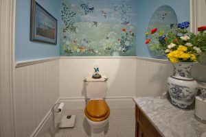 With all the woodwork finished, it was time to paint. This room was kind of Lori’s choice, since my choices will rule the main bathroom. She went with Foamy Surf for the upper walls, and Chalk for the woodwork, both from Clark + Kensington.